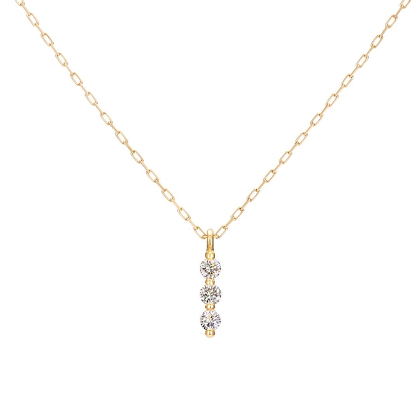 3つのメレダイヤモンドが、胸元でさりげなくきらめくネックレス。繊細なチェーンと小ぶりなペンダントトップの組み合わせは自然と肌に馴染むことから「スキンジュエリー」とも呼ばれ、まるで自分の一部かのようにデイリーに身に着けられます。