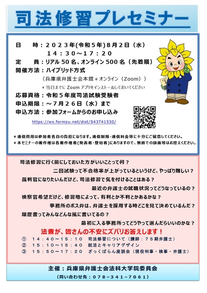 2023年(令和5年)8月2日(水)14:30~17:20にて「司法修習プレセミナー」を開催します。