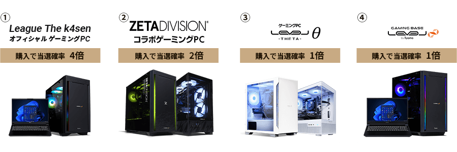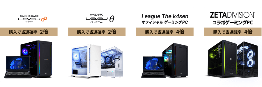 League The k4sen オフィシャル ゲーミングPC、またはZETA DIVISION LEVEL∞ コラボゲーミングPCのご購入で当選確率が4倍。