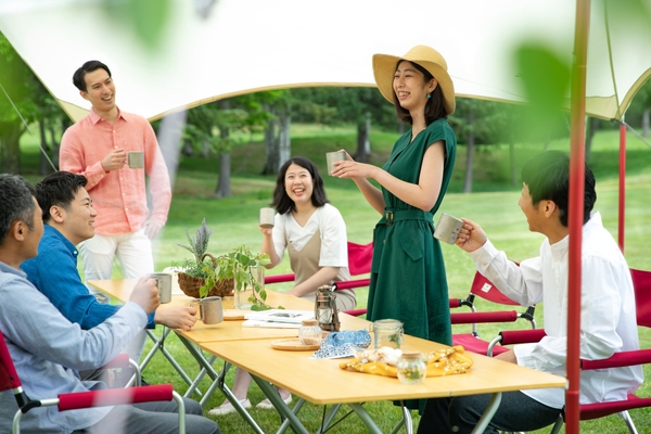 リゾナーレ八ヶ岳では、焚火を囲んでのオーダーメイド二次会をはじめ、館内では気軽にワインを楽しみながら、仲間との語らいを楽しめるワインテイスティングスペースもご用意しています。リゾナーレトマムでは、ご要望に合わせてテントやタープを張り、焚き火やお酒と共に楽しむ滞在や、テラスでの食事などバリエーション豊かな提案が可能です。