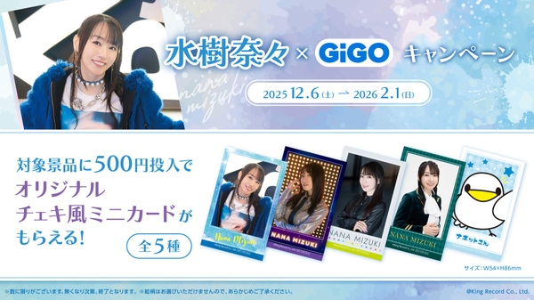 株式会社GENDA GiGO Entertainment(本社:東京都港区 代表取締役社長:二宮 一浩、以下「当社」)は、GiGOグループのお店におきまして、声優・歌手・ナレーター等マルチに活躍しているアーティストの水樹奈々さん(StarCrew(事務所)キングレコード(レーベル)所属)とコラボした「水樹奈々×GiGOキャンペーン」を2025年12月6日(土)より開催いたします。