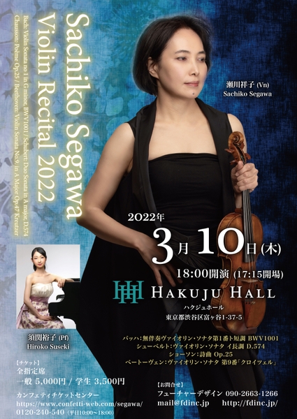 『瀬川祥子ヴァイオリンリサイタル2022【延期公演】』が2022年3月10日 (木)にHakuju Hall(東京都渋谷区)にて開催されます。チケットはカンフェティ(運営:ロングランプランニング株式会社、東京都新宿区、代表取締役:榑松 大剛)にて発売中です。