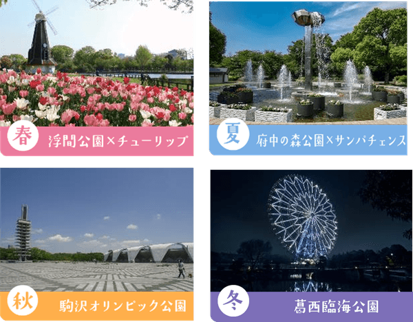 都立公園では、令和4年春の浮間公園を皮切りに、夏の府中の森公園、秋の駒沢オリンピック公園、冬の葛西臨海公園において、大花壇やLEDイルミネーションで演出するなど、四季を通じた花と光の演出による新たな魅力の創出のための取組を展開しています。