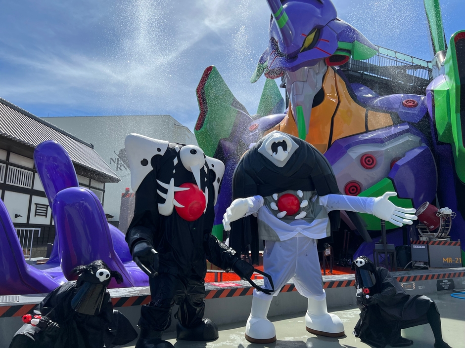 東映太秦映画村では、2020年秋、世界初の乗れるエヴァとして、高さ15mの圧倒的存在感を放つ初号機が話題となり、昨年の夏は、お客様を夏の特別演習に参加するパイロット候補生に見立て、巨大な使徒が襲う試練に見舞われる設定のショーを実施。ウオーターキャノンが炸裂する最中に繰り広げられる“スプラッシュ体験”が大変好評をいただきました。