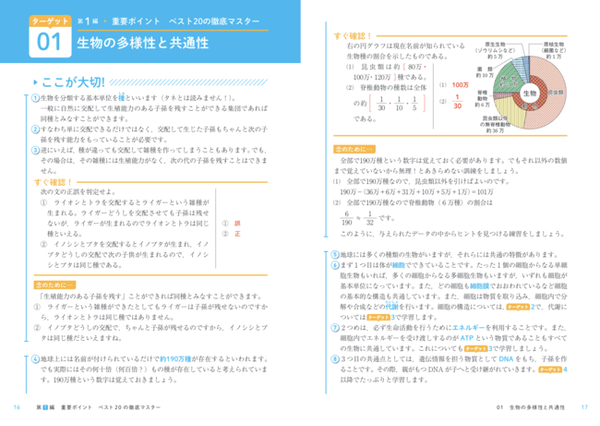 第1編がマスターできたら次は第2編です。第2編では、テーマ別完全対策として、実験問題やグラフ問題、会話文問題などに強くなるコツが掲載されています。顕微鏡操作やDNA 抽出などを取り上げており、これによりさらに実戦的な力が身に付きます。この第2編のテーマ別完全対策も類書にはない本書の大きな特長です。