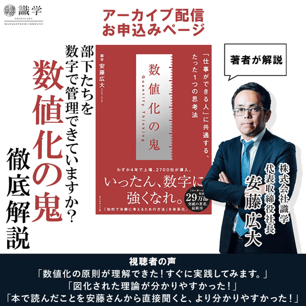 9年で4000社以上が導入した「いま、もっとも人を成長させるマネジメント法」の識学。全プレーヤー向けに「仕事ができる人」に共通する型を株式会社識学 代表取締役社⻑ 安藤 広⼤がお伝えします。