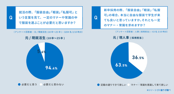 前述した「服装自由」で服選びに困ったことのある就活生と、就活生が服選びに困っていると認識している人事担当者の結果の他に、「就活の際の「服装自由」という言葉には一定のマナーや常識の中での服装選びが必要だと思うか」という問いについては、就活生の94.4%がそう思うと回答したのに対し、人事担当者の63.5%は文字通りの解釈で、自由な服装で面接を受けて構わないと回答しています。