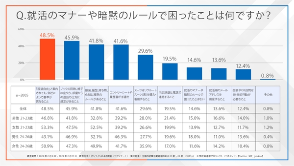 学校総選挙プロジェクトが実施した調査においても、就活のマナーで困ったこととして『「服装自由」と案内されても、会社によって基準が異なること』が最も多く、48.5%にのぼりました。
