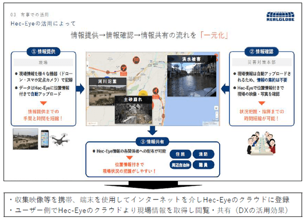 「Hec-Eye」はリアルグローブが、一般社団法人EDAC監修のもと開発した、ドローン等からの取得情報を地図上に集約し共有するプラットフォームで、総務省の「平成27年度補正予算IoTサービス創出支援事業」の採択案件を通じて構築されたリファレンスモデル(成果物)を核として開発されたサービスです。救急医療・災害対応分野での活動支援や業務効率化を目的として開発され、現在は鳥獣害対策や観光分野等も含めたより広い分野で活用されています。
