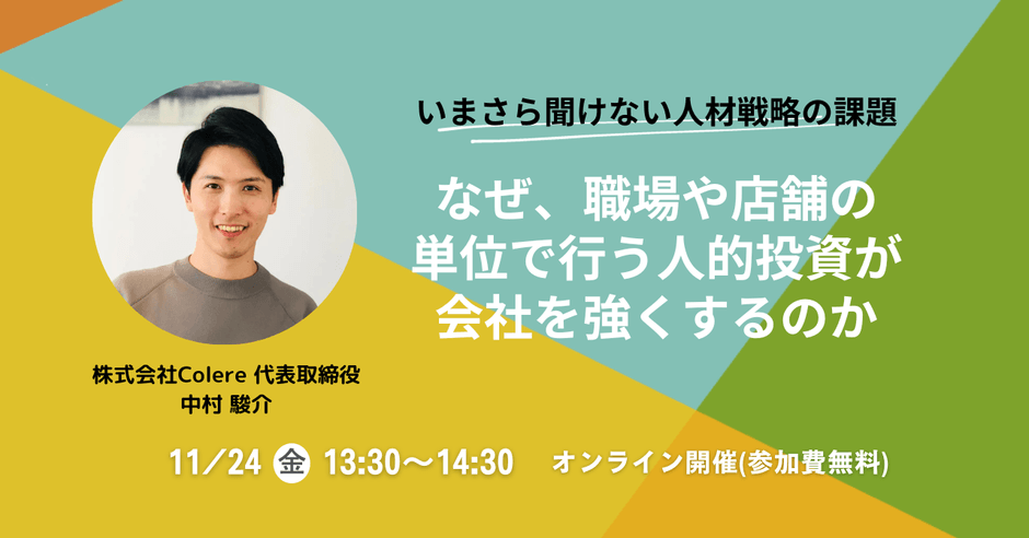 Colereでは、変化が早い時代の競争戦略として、顧客やユーザーに近い職場や店舗に適切な人的投資を行うことが会社の成長につながると考えており、皆様の職場や店舗の個別課題や強みを発見する方法をお伝えしております。