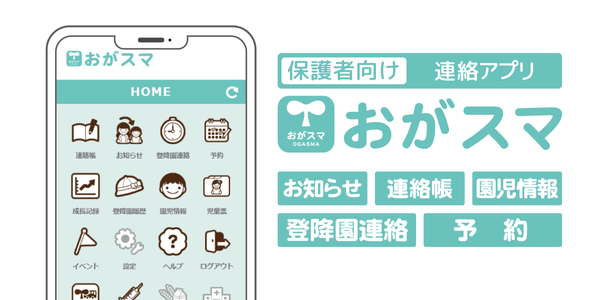 保護者向けスマートフォンアプリ「おがスマ」は教育・保育施設と連携しメッセージを受信したり、欠席や一時預かりの予約・連絡帳のやりとりをする事ができます。