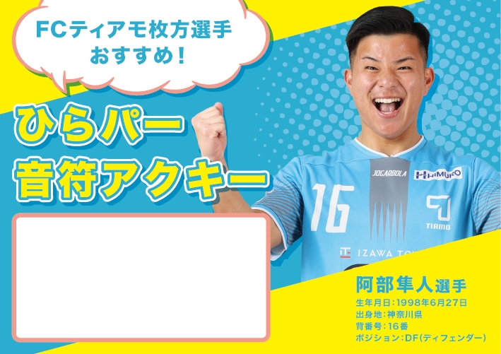 阿部隼人選手は、ひらかたパーク「ノームショップ」で勤務をしながら、FCティアモ枚方に所属。明るく堅実な仕事ぶりで、チームでもショップでも頼りになる存在として活躍中です。