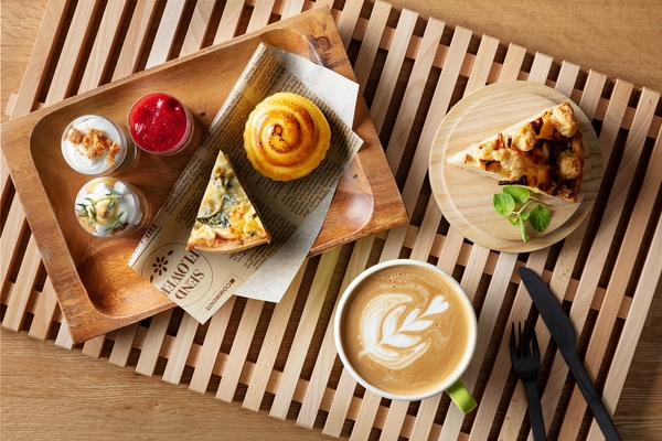 TAMARIBAで仕事をし、一息つきたい時にはBEB5軽井沢のカフェメニューがおすすめです。食べ応え十分のキッシュやアップルパイ、カフェラテなどがカフェカウンターでオーダーできます。プラン特典として、コーヒーは何杯飲んでも無料です。