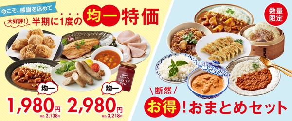 一番の目玉品は、なんといっても均一特価食品セット。から揚げなのに揚げていないヘルシーな”揚げないとりから”と”からあげ風チキン”の「からあげセット」は520円もお得な1,980円。定番で人気のカレーやシチューがセットになった「レトルト5種セット」も2,980円と大特価。SONOKO食品が大好きな方も、一度は食べてみたいなという方も、今がチャンスです。