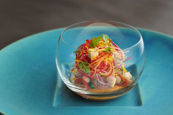 前菜には赤マチと、人参やビーツなどの野菜のジュリエンヌをサラダに仕立てた一品です。淡泊な味わいの赤マチをやいま味噌でマリネすることで旨味を補完します。また、豆腐ようのピューレやパパイヤのドレッシングと和えると、全体がコクのある味わいにまとまります。ジュリエンヌをサンゴに見立て、海の中をイメージした彩り豊かな前菜です。
