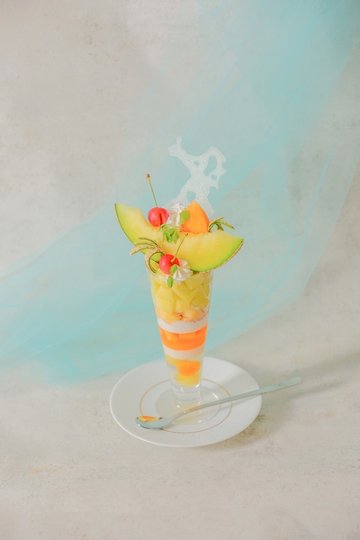クラウンメロン、赤肉メロン、佐藤錦(さくらんぼ)、ライチクリーム、飴飾り、ハニーステビア