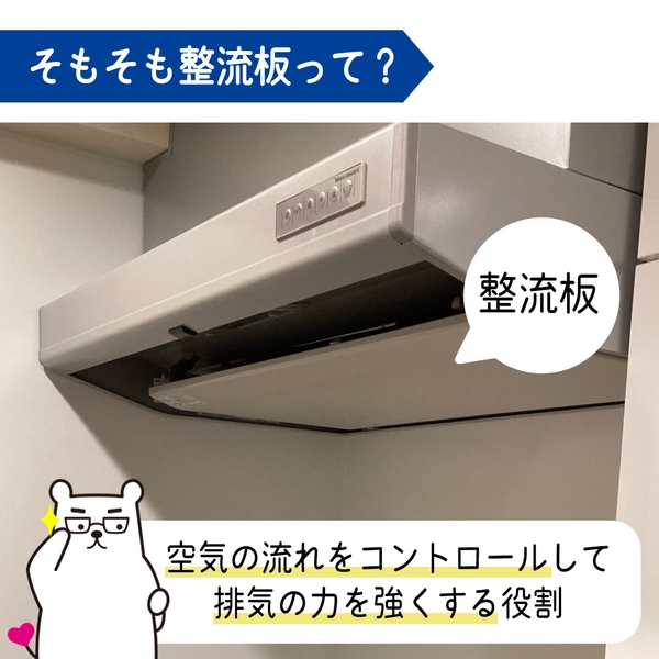 この整流板に空気が当たってからレンジフード内部へ流れることで空気の流れがコントロールされ、吸気の力が強くなる仕組みです。