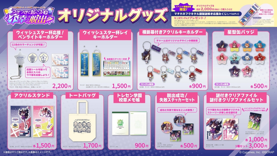 オリジナルグッズは『つぎつぎと起こる不幸からの脱出』開催会場及びCygamesの公式オンラインショップCyStore(https://cystore.com/)にて販売いたします。