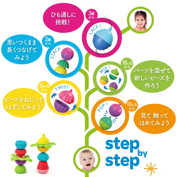 1つのおもちゃで10ヶ月から36ヶ月 (3歳)まで楽しむことができ、手指の触感 (低年齢向け) から始まり、手の運動を促す設計になっています。