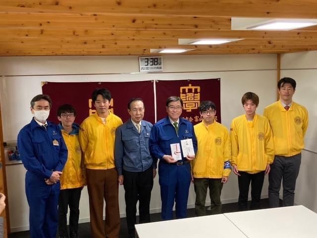 高島会長らは災害ボランティアとして復旧活動を手伝うため、14日に天白キャンパスを出発して午後に氷見市入りし、市役所で林市長に寄付金の目録を手渡しました。高島会長は「元日の地震で心が痛み、みんなで1月5日から募金活動を始めました。少しでも早く震災前の生活が取り戻せるようにできる範囲で精いっぱい頑張りたい」と災害ボランティアとしての活動に意欲を示しました。