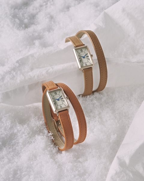 前作「月華」が纏っていたのは、ステンレスバングルの凛とした輝き。今作ではその輝きに、よりしなやかな“流れ”が重なります。手首を静かに2周するレザーストラップが、月光のように腕に沿い、花のように軽やかに美しく、確かな存在感をまとわせます。小ぶりなスクエアケース(29mm×19mm)は同じ佇まいのまま、素材の変化が“新しい表情”を生み出しました。細くしなやかなレザーが二重に重なることで、一本の線では生まれない“奥行き”と“動き”が腕元に生まれ、その重なりが月が描く静かな流れのような優雅さを添えます。柔らかなラインが腕元に自然な広がりを生み、アクセサリーのような軽やかさで日常を彩ります。光と影の調和が生む、月華の世界観。クラシカルなローマ数字、ミニマルなフェイス。それらが二重レザーの質感と重なり合い、“線の美しさ”と“余韻”をより際立たせます。レザーがつくる柔らかな影、ケースが放つ控えめな光。そのコントラストが、ツキコレクションが描いてきた静かな美の世界観をより豊かに広げていきます。