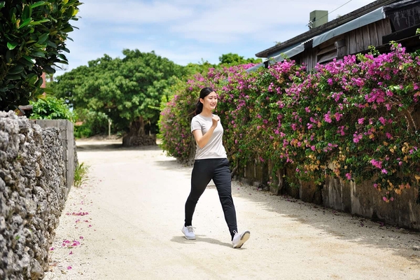 早朝に、重要伝統物群保存地区に指定された町並みが残る竹富島の集落へ出掛けます。腕を大きくスイングしながら足裏でしっかりと地面を踏み、体全体を使って早足で歩く「島風パワーウォーク」を体験します。鼻から吸って口から吐く深い呼吸を組み合わせ、全身に酸素を巡らせます。朝日が昇る頃は、日帰り観光客が少なく、穏やかな島風を感じながら歩くことができる時間帯です。沖縄の原風景が残る町並みを眺めながらしっかり歩き、その後の快眠に導くための適度な疲労を体に与えます。