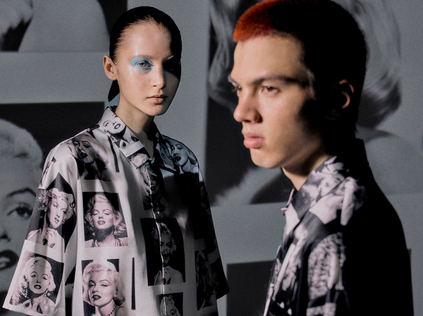 「オードリー・ヘップバーン」「マリリン・モンロー」の象徴的な写真をコラージュし総柄プリントしたシャツ。