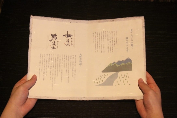 酒造りに使用する仕込み水や酒米、大町市と池田町の協力酒蔵についての紹介した界 アルプスオリジナルの「水も酒もうめぇずら」公式テキストが貸出されます。水とともに発展してきた地元の伝統工芸品である松崎和紙に、1枚1枚丁寧にすき込まれており、テキストの体裁を通しても地元の魅力に触れることができます。普段よく耳にするけれど、詳しく知らなった水の硬度の話や、水にまつわる大町の魅力も知ることができます。