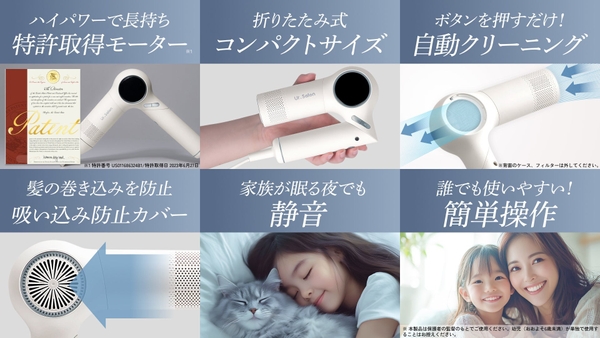 コンパクトに折りたためるデザインで、収納時もスリムに収まり、旅行や外泊にも気軽に携帯できます。お気に入りのヘアケアを、いつでもどこでも楽しめる利便性を備えています。また、家族が眠る夜でも安心の静音設計を実現しています。さらに、自動クリーニング機能や髪の巻き込みを防ぐカバー設計、誰でも使いやすい操作仕様など、毎日の使用を支える使いやすく安心な工夫が満載です。