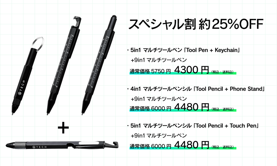 Makuake限定のset品は、一般販売価格が税込3500円の9in1マルチツールペンとのセットで税込4300円〜