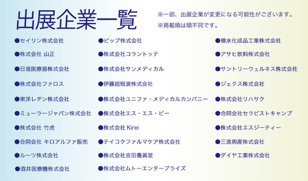 当社が主催する柔道整復師・鍼灸師のための展示商談会です。当日は出展メーカーの新商品や人気商品の展示を行うだけではなく、豪華な講師陣をお招きし、当日限定の特別セミナーを開催いたします。入場の事前予約については、当社のWEBサイト等で受付を行っております。皆さまのご来場をお待ちしております。※柔道整復師・鍼灸師限定のイベントです。