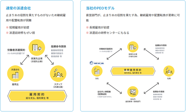 そこで、当社では、人材派遣会社自身が受け皿となり、自社で従業員の長期雇用を確保しつつ、スキルアップを行いながら必要に応じて人財を供給することで、企業側が終身雇用を維持できなくても人の働く場を確保できるようにする「日本版PEO」モデルを模索してまいりました。
