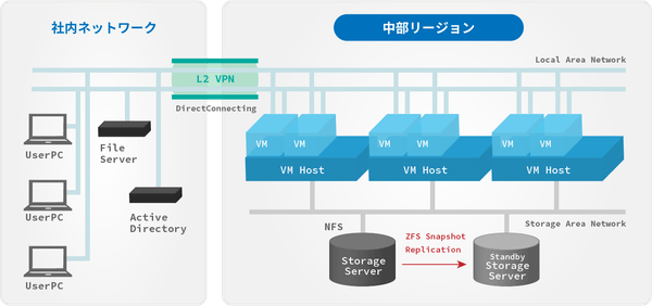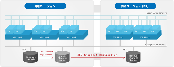 中部リージョン・関西リージョンで複数拠点DR(ディザスタリカバリ)構成で、災害などからのシステム復旧に備えます。