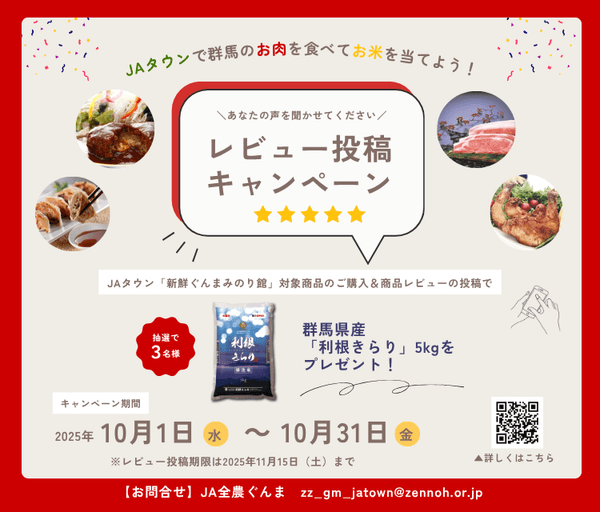 JA全農が運営する産地直送通販サイト「JAタウン」のショップ「新鮮ぐんまみのり館」は、10月1日(水)から10月31日(金)まで、「JAタウンで群馬のお肉を食べてお米を当てよう!ぐんまの肉レビュー投稿キャンペーン」を開催しています。