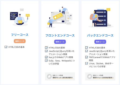 フロントエンドコース、バックエンドコースの2コースから選択するだけで、コースに合わせたカリキュラムのオンライン学習が可能になります。