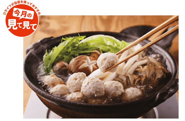 昨年発売しご好評をいただいた「お肉屋さんの生つくね」は、お肉の旨味をギュッと閉じ込めたライフオリジナルの生つくねです。鶏肉をこねる際、お肉の食感がしっかりと残るよう混ぜすぎに注意し、かつ見た目もきれいな丸形になるよう成形しています。今年は「しょうが香る生つくね」が新たにラインナップに加わり、さまざまな味をお楽しみいただけます。つくねから溢れる肉汁で旨味がアップしたおいしい鍋をご自宅でお試しください!