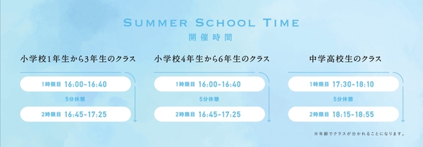 開催時間は、小学生の2クラスは16:00~17:25、中高生のクラスは17:30~18:55になります。