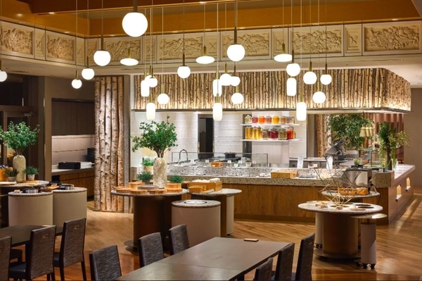 ホテルハーヴェスト旧軽井沢のブッフェレストラン「彩」は【FOREST ACTIVITY~信州軽井沢の恵みと出会う。森の「アクティビティ」~】をテーマに、白樺の木を基調とした温かみのある、開放感溢れる空間に店内を改装しました。新メニューには株式会社ユーハイム(以下「ユーハイム」)が開発したAI搭載のバウムクーヘン専用オーブン「THEO(テオ)」による「焼きたてバウムクーヘン」や、旬のフルーツを使った自家製「季節のフルーツタルト」が登場します。また、活気と躍動感溢れるライブキッチンではスパイスが効いたジューシーな「ローストビーフ」や、信州食材の林檎、杏、花豆と旬野菜をサクッと揚げた「天ぷら」をご用意いたします。お肉、野菜、果実の“信州の恵み”が詰まった和洋50種類以上のお料理をお楽しみいただけます。