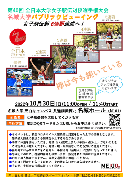 これまでは大学関係者のみで開催していましたが、今回より女子駅伝部及び名城大学を応援してくださるすべての方々と一緒に名古屋から応援したいと思っています。