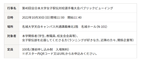 2022年10月30日(日)宮城県仙台市で行われる「第40回全日本大学女子駅伝対校選手権大会」のパブリックビューイングを名城大学天白キャンパスで開催します。