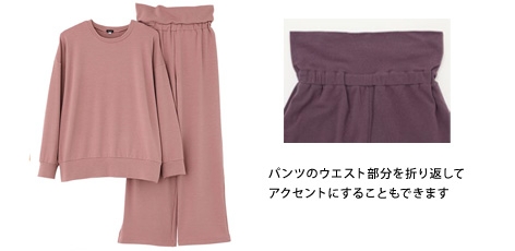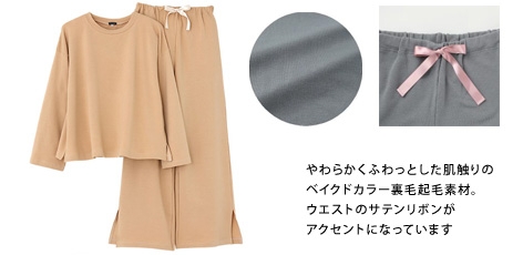 「ベイクドカラー裏毛起毛」は、ドロップショルダーの長袖とワイドパンツのゆったりシルエット。人気のピンクやキャメル などくすみカラーでリラックスタイムにぴったり