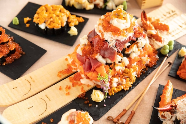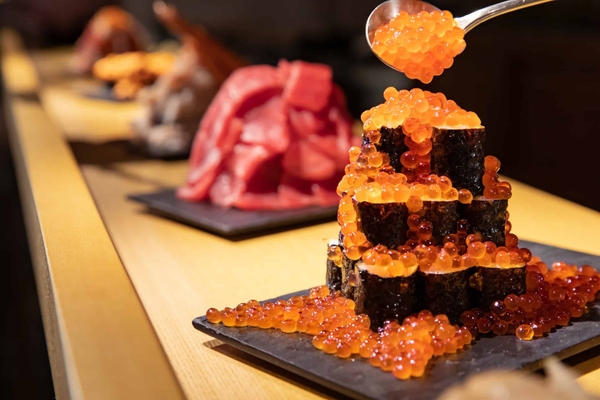 こぼれ寿司に使用する海鮮は、主にイクラ、カニ、マグロ、ウニ、ホタテです。冬の魚介類は、寒さの深まりとともに身が詰まり、上質な脂がのるため、味わいが増すと言われています。このような旬の海鮮をこぼれるぐらいに盛り付けた寿司を、当リゾートではこぼれ寿司と名付けました。