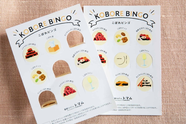 こぼれ寿司のメニュー表として使用するのは、ビンゴカードです。全9マスあるカードには、1マスに1品が記載されており、お客さまが注文した商品のマス目を開けることができます。ビンゴが完成すると、開けた列の商品のうち1品の海鮮をさらに寿司の上に追加するもうひとこぼれというサービスを受けられます。