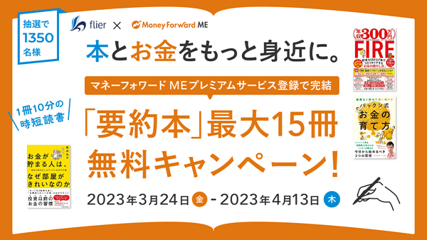 株式会社マネーフォワードは、2023年3月24日(金)より、『マネーフォワード ME』プレミアムサービスを新規でご登録いただいた方を対象に、本の要約サービス「flier(読み方「フライヤー」)」の無料購読チケットが抽選で当たるキャンペーンを開催します。