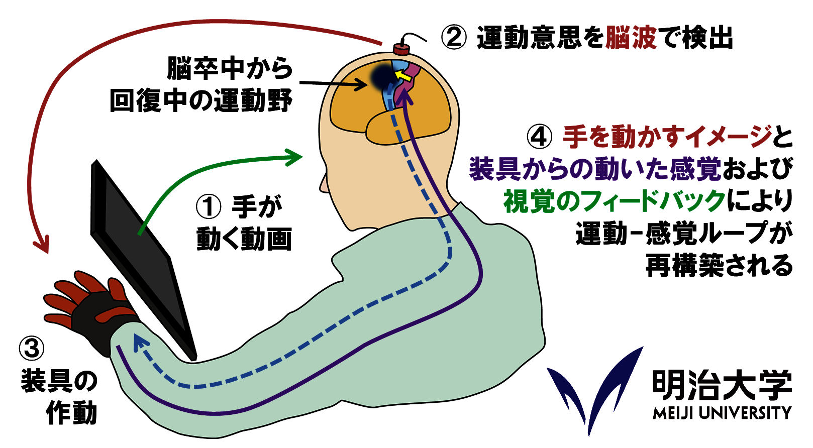 明治大学理工学部・電気電子生命学科(生命理工学専攻)の小野弓絵准教授と穂翔会村田病院(大阪市生野区)の村田高穂院長、富永孝紀リハビリテーション室長らは、手に麻痺をもつ脳卒中患者の「手を動かしたい」という意思を脳波から検出し、患者の手に取り付けた装具を動かすことで、タイミングよく手の動作感覚をフィードバックする技術「Digital Mirror Box」を開発しました。