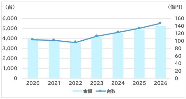 人手不足を背景に、生産・物流現場での自動化が進む中、AGV(無人搬送車)への関心が高まっている。2023年の国内AGV市場は約4,200台、110億円規模と推定され、コロナ禍の影響で縮小した2022年から大幅に回復。人手不足や人件費の上昇が自動化ニーズを押し上げ、特に工場の生産効率化や物流倉庫の投資が活発化している。市場は2024年以降も堅調に成長を続け、年間10%の増加率で2026年には5,500台、140億円に達すると予測される。長期的には、低コスト化製品の拡充により中小企業への普及が進むほか、導入済みAGVのリプレース需要が市場成長を支えると期待される。これにより、物流と製造現場での自動化がさらに加速する見通しである。