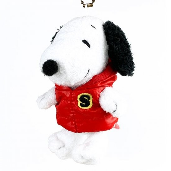 赤いダウンがキュートなスヌーピーのマスコットチェーンもあります♡リアルなダウンジャケットがオシャレで、スヌーピーの手触りもふわふわです。