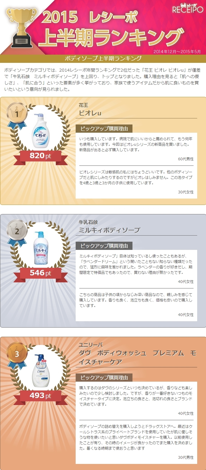ボディソープカテゴリでは、2014レシーポ年間ランキングで2位だった「花王 ビオレu」が僅差で「牛乳石鹸 ミルキィボディソープ」を上回り、トップとなりました。購入理由を見ると「肌への優しさ」、「肌に合う」といった要素が多く挙がっており、家族で使うアイテムだから肌に良いものを買いたいという意向が見られました。
