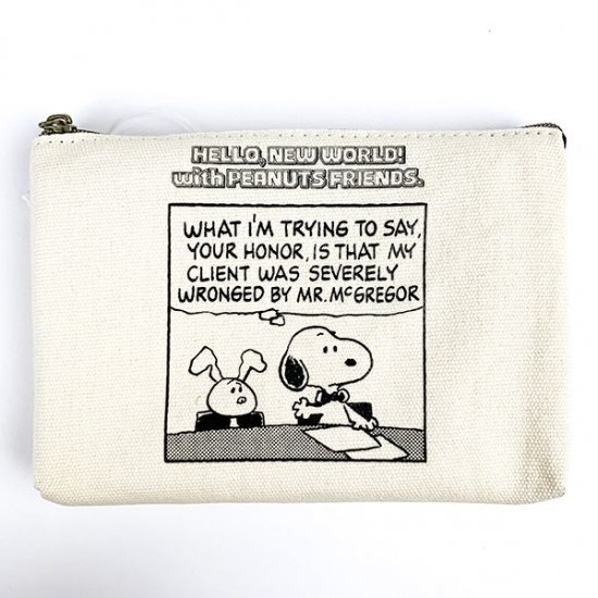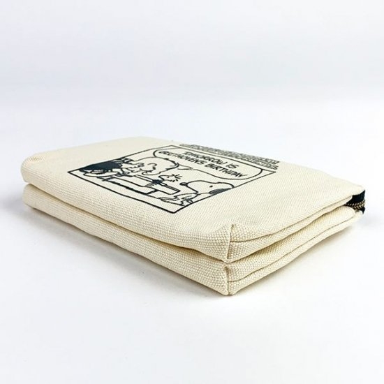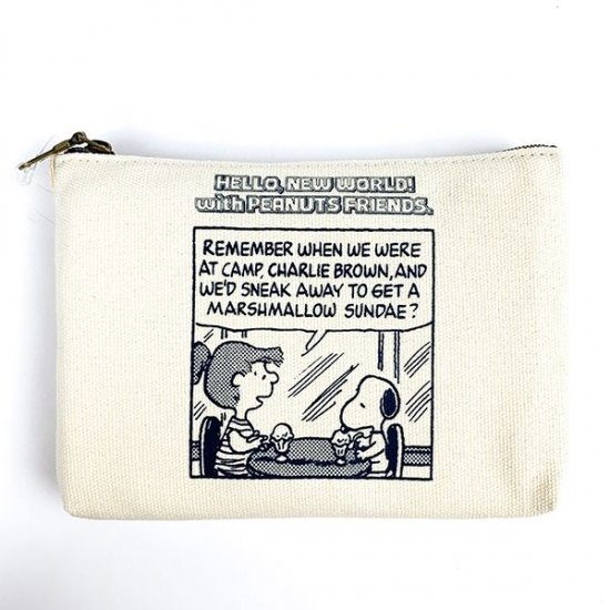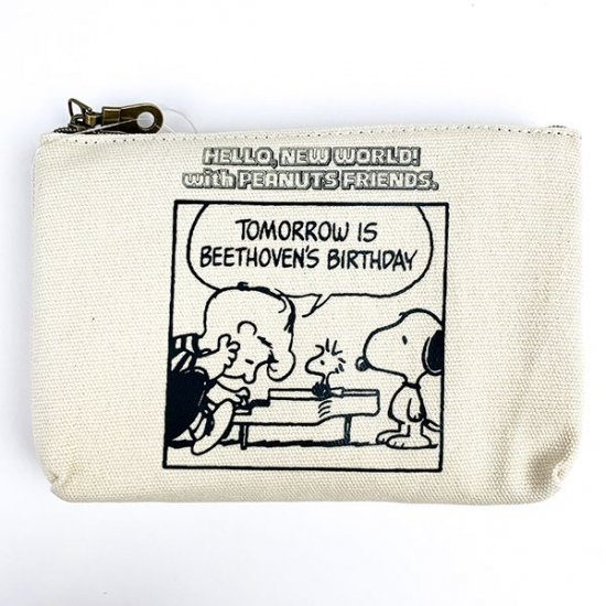 画像のこちらは、キャンバス地のポーチ。シュローダーとスヌーピーのデザインで、コミックの1コマのようなデザインです。