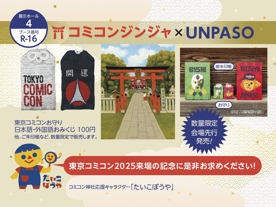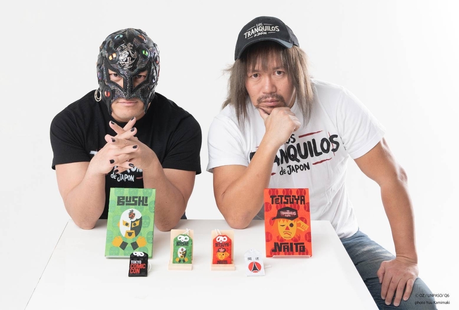 東京コミコン2025の出展ブース、コミコンジンジャ×UNPASO(ブース番号R-16)では、京都の老舗織工房で特別に製作された、東京コミコン御守りなどの販売に加え、内藤哲也、BUSHI完全監修よる御守、御朱印帳、絵馬などを会場先行・数量限定で販売。また、LOS TRANQUILOS de JAPON(ロス トランキーロス デ ハポン)のTシャツ、キャップなども販売致します。